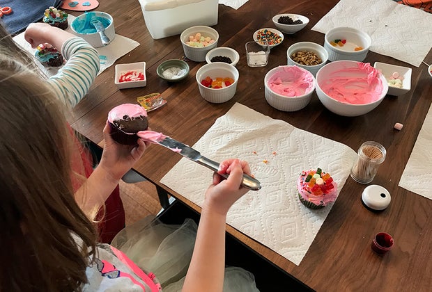 Buy pre-made frosting (and even cupcakes) and set up a cupcake decorating station with whatever candies, nuts, and sprinkles you have on hand.