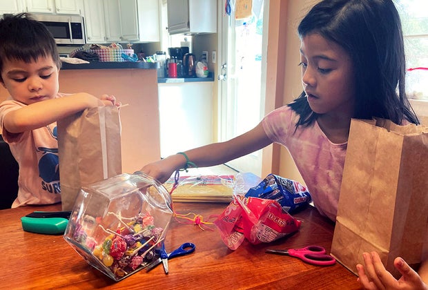 Start with the best part—the candy! Be sure to fill the bag only about halfway.